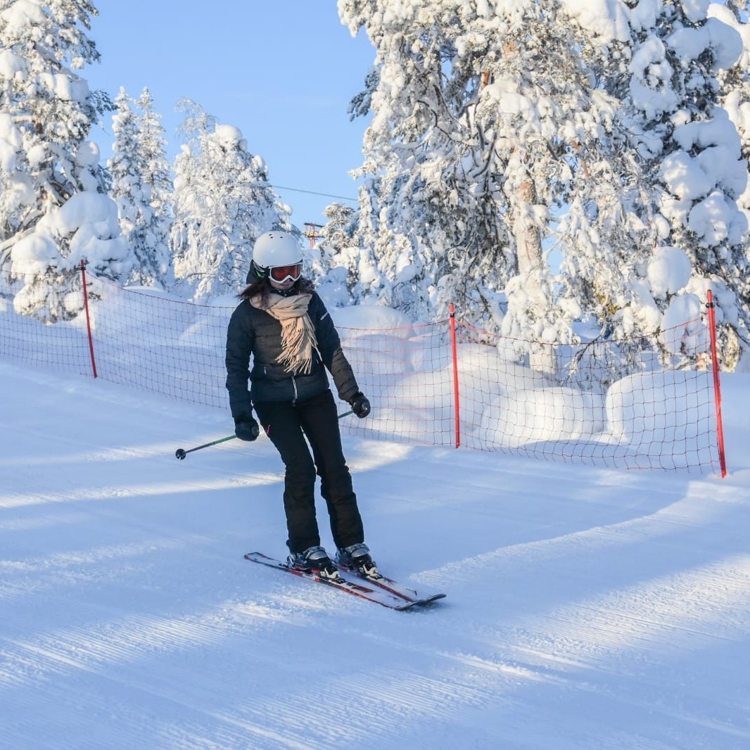 Voit vuokrata meiltä hiihtosukset, sauvat ja monot 30€/setti/päivä.