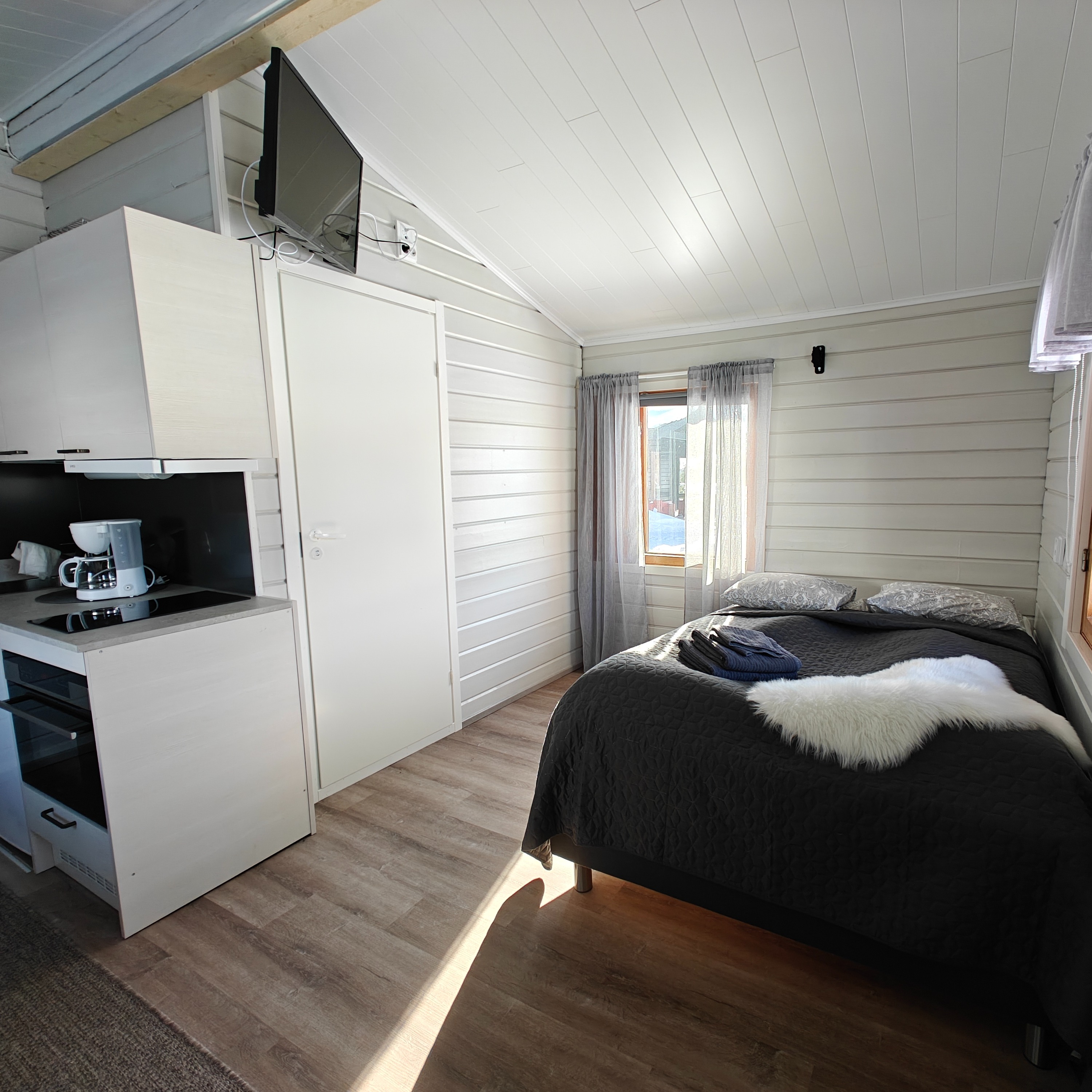 Sympaattisesta kahden henkilön mökistä löytyy sänky kahdelle, keittiö (mikro+uuni-yhdistelmä, kahvi- ja vedenkeitin, leivän paahdin sekä jääkaappi), suihku sekä televisio.