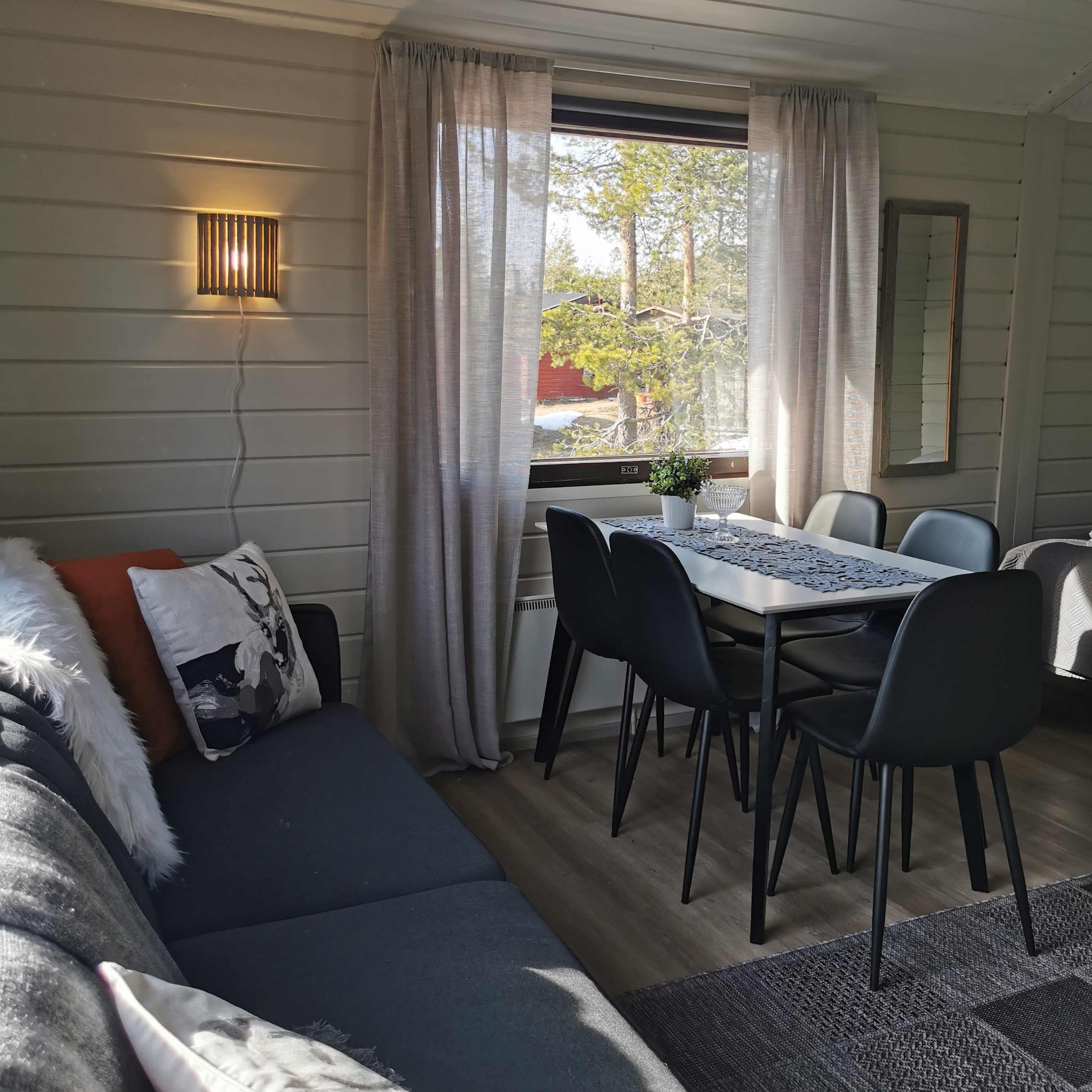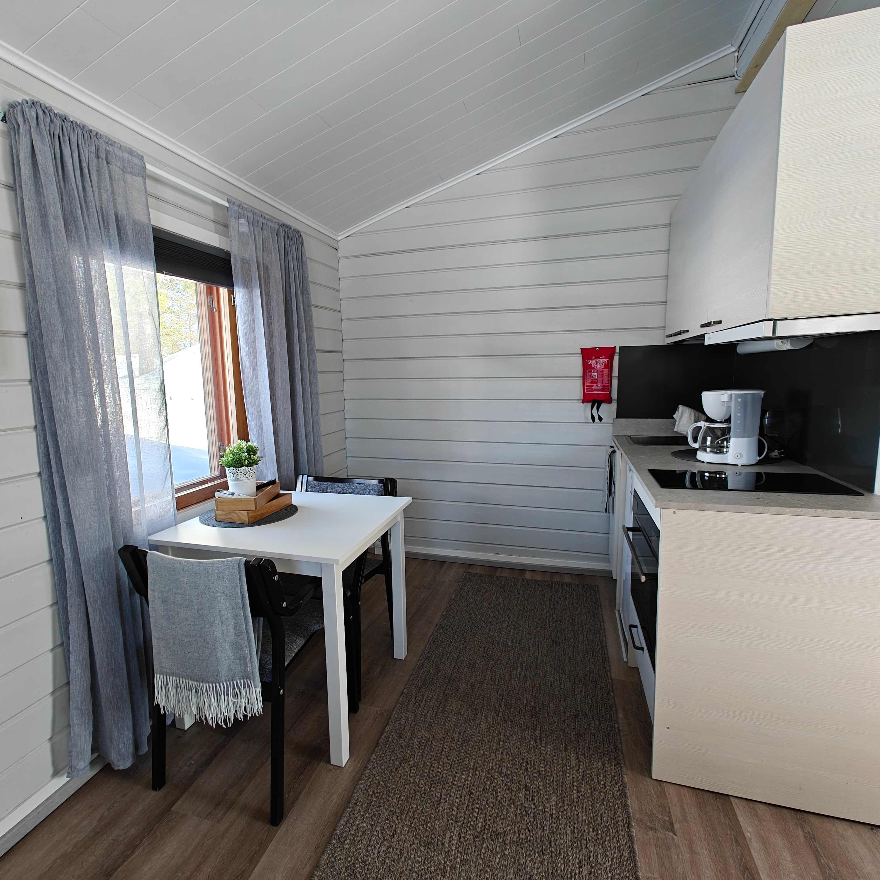 Tunnelmallisesta neljän henkilön mökistä löytyy 4 sänkyä + vuodesohva, josta saa lisäpedin kahdelle henkilölle, keittiö (mikro+uuni-yhdistelmä, astianpesukone, kahvi- ja vedenkeitin, leivän paahdin sekä jääkaappi), suihku ja sauna, takka sekä televisio.
